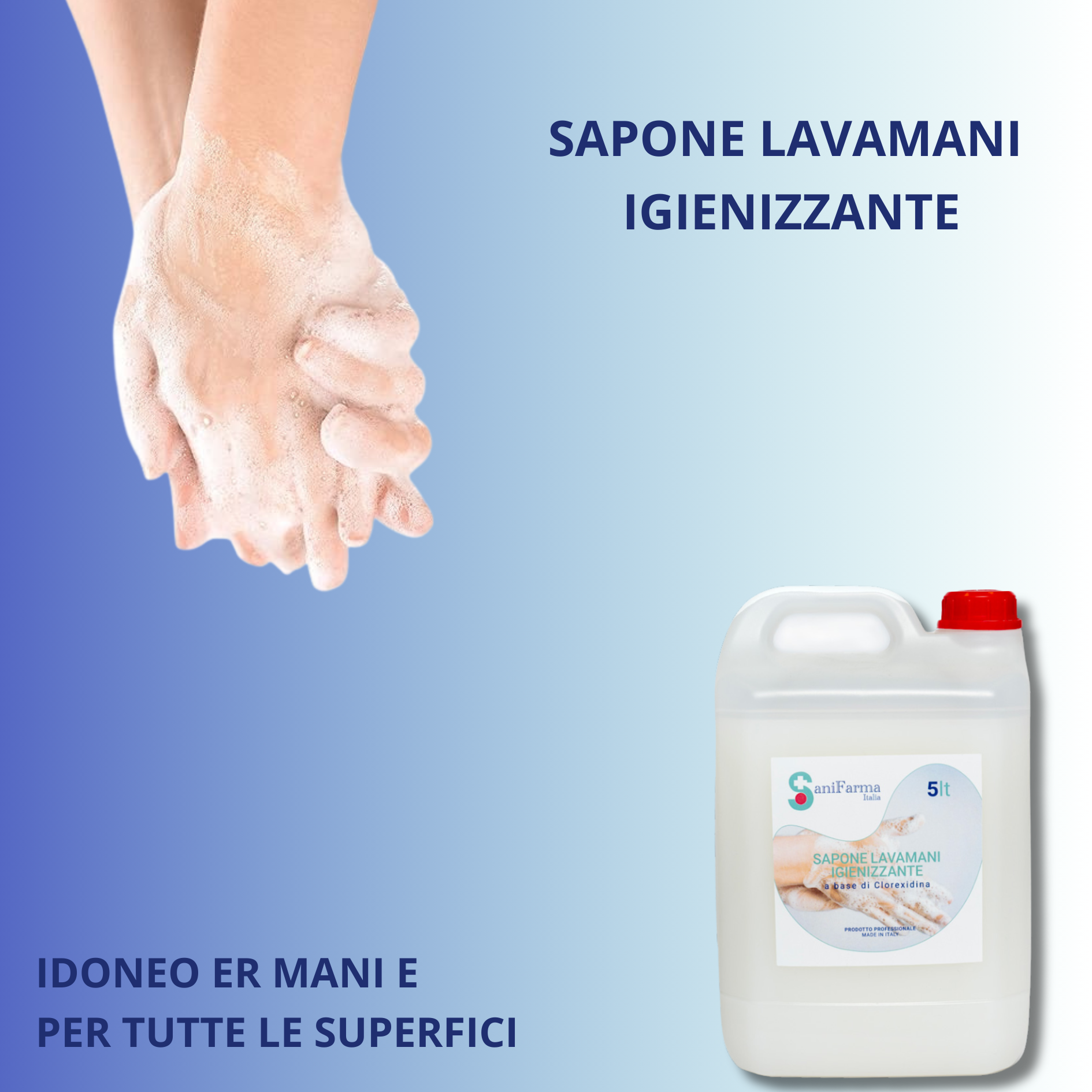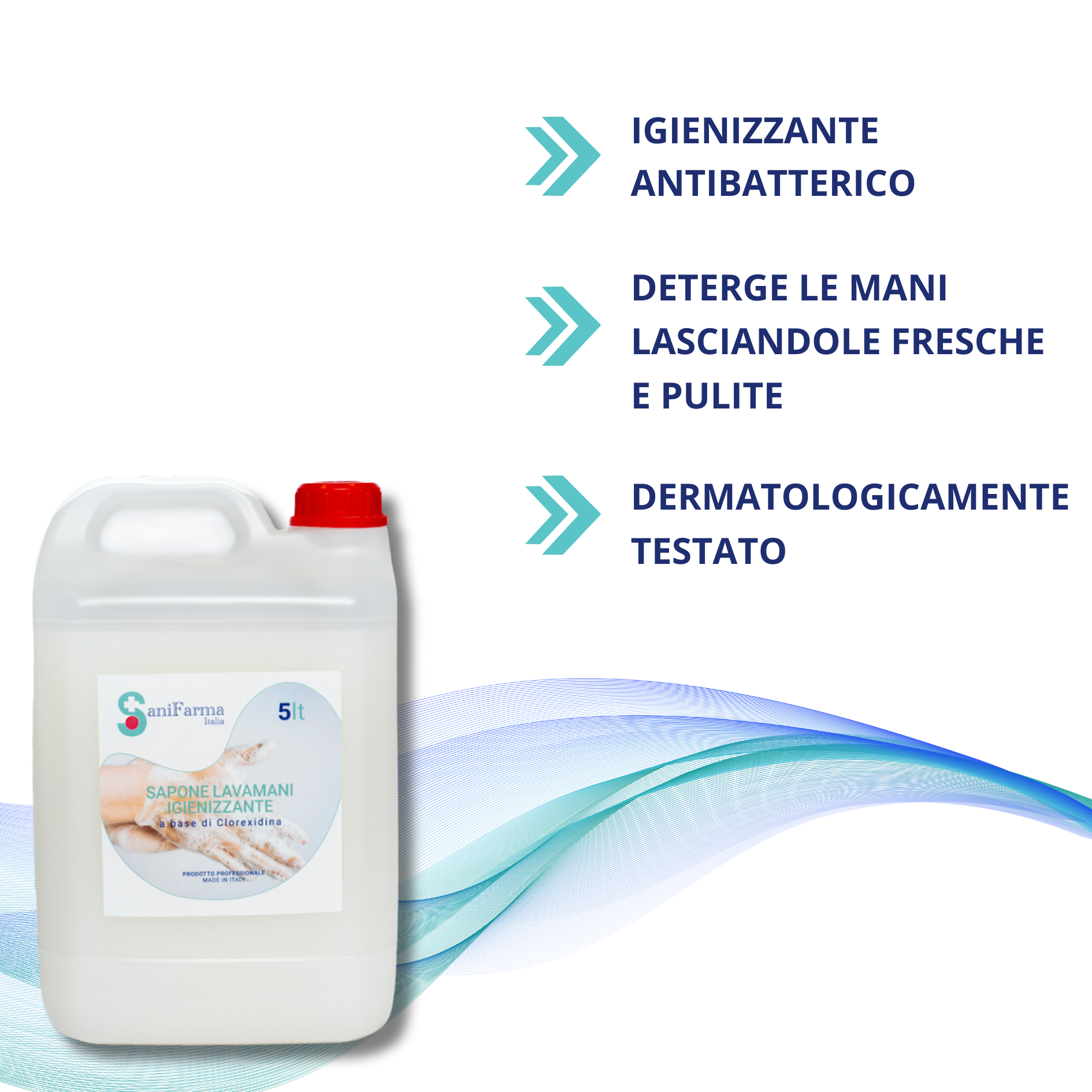 Sapone liquido igienizzante Saniman tanica 5Lt. Detergente cremoso a pH neutro, non irritante, con proprietà antibatteriche e sanificanti